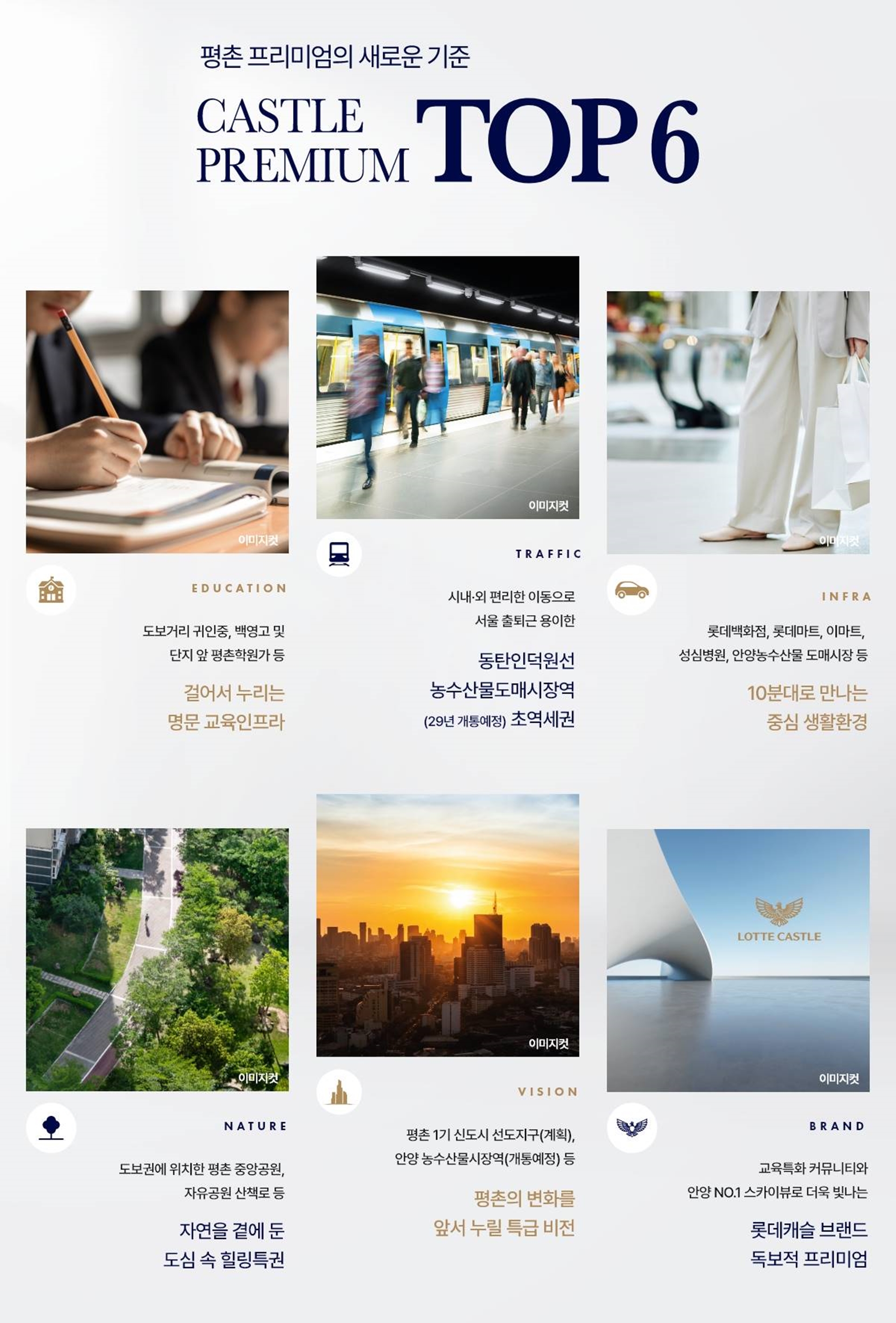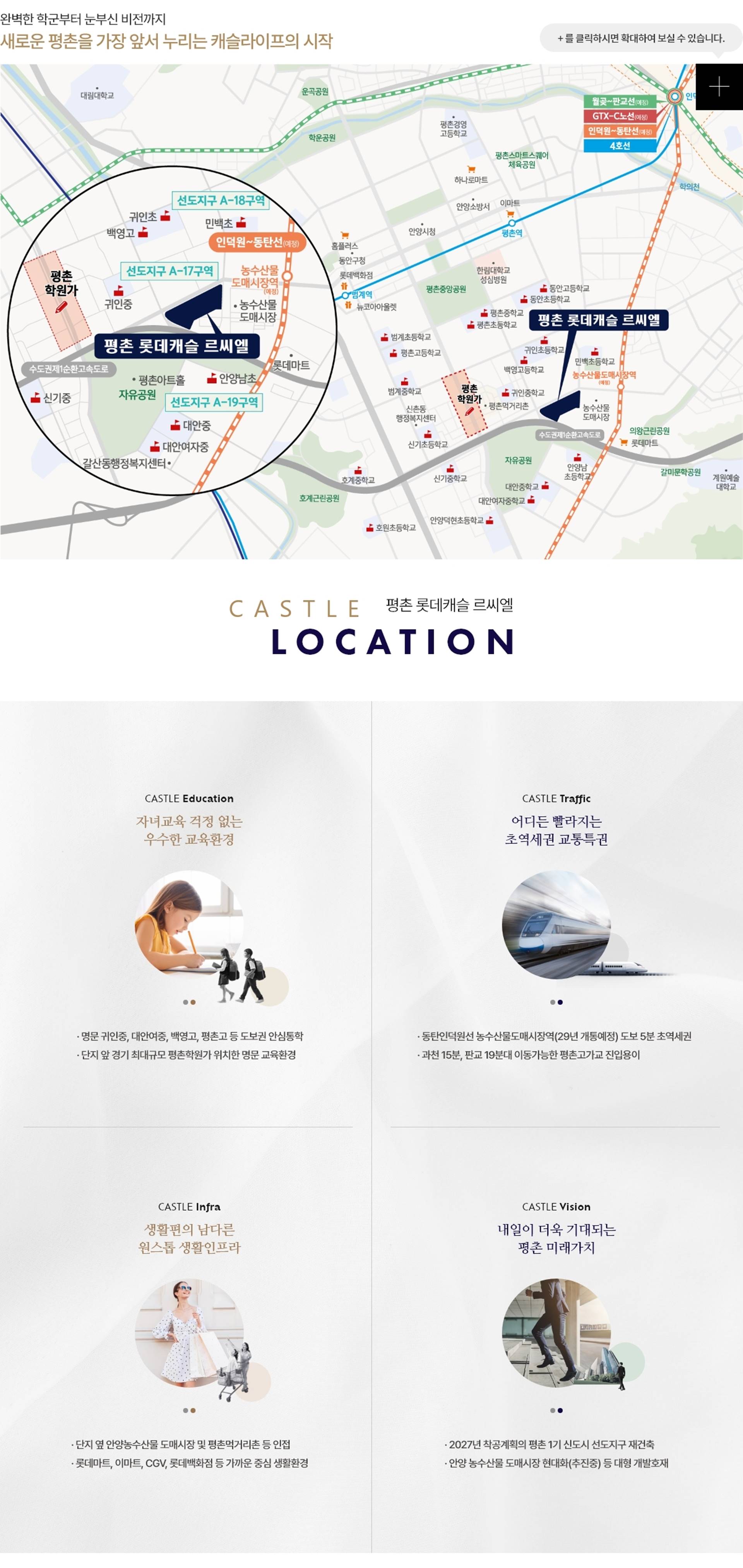 롯데건설이 짓는 르씨엘 하이엔드 평촌 지역에서 만나는 롯데캐슬의 최고급 주거 가치 롯데캐슬 중에서도 특별한 가치를 담은 '르씨엘' 등급의 설계가 적용되어 평촌의 주거 수준을 한 단계 높이는 랜드마크로 조성됩니다. 총 960세대 대단지, 최고 32층 스케일 임곡3지구 재개발을 통해 완성되는 새로운 주거 중심 대규모 재개발을 통해 총 960세대로 조성되며, 지상 최고 32층의 높이로 안정적인 관리 효율과 함께 우수한 조망권을 확보합니다. 안양역(1호선), 범계역(4호선) 더블 역세권 서울 및 강남 접근성이 뛰어난 편리한 대중교통망 1호선 안양역과 4호선 범계역을 모두 이용 가능한 입지적 장점으로 수도권 주요 업무 지구로의 출퇴근이 매우 편리합니다. 명문 평촌 학원가 도보 이용 가능 안양 최고의 교육 인프라를 가까이에서 누리는 교육 특권 자녀 교육에 중요한 평촌 학원가를 손쉽게 이용할 수 있어 최상의 면학 분위기와 우수한 입시 경쟁력을 갖춥니다. 롯데백화점, 뉴코아아울렛 등 원스톱 생활 평촌의 핵심 상권을 모두 누리는 풍부한 편의 시설 롯데백화점, 이마트, 뉴코아아울렛 등 평촌의 주요 쇼핑 시설이 인접하여 쇼핑, 문화, 외식 생활을 단지 가까이에서 해결할 수 있습니다. 다양한 라이프스타일을 위한 맞춤 평면 중소형부터 대형까지, 세대 구성에 맞는 선택의 폭 실수요 선호도가 높은 다양한 평형대로 구성되어 각 가족 구성원들의 생활 패턴에 최적화된 주거 공간을 제공합니다. 품격 있는 단지 설계와 커뮤니티 입주민 전용 시설과 쾌적한 조경을 갖춘 공원형 단지 피트니스, 골프연습장 등 입주민을 위한 고급 커뮤니티와 친환경적인 조경 설계로 쾌적한 휴식 공간을 완성합니다.